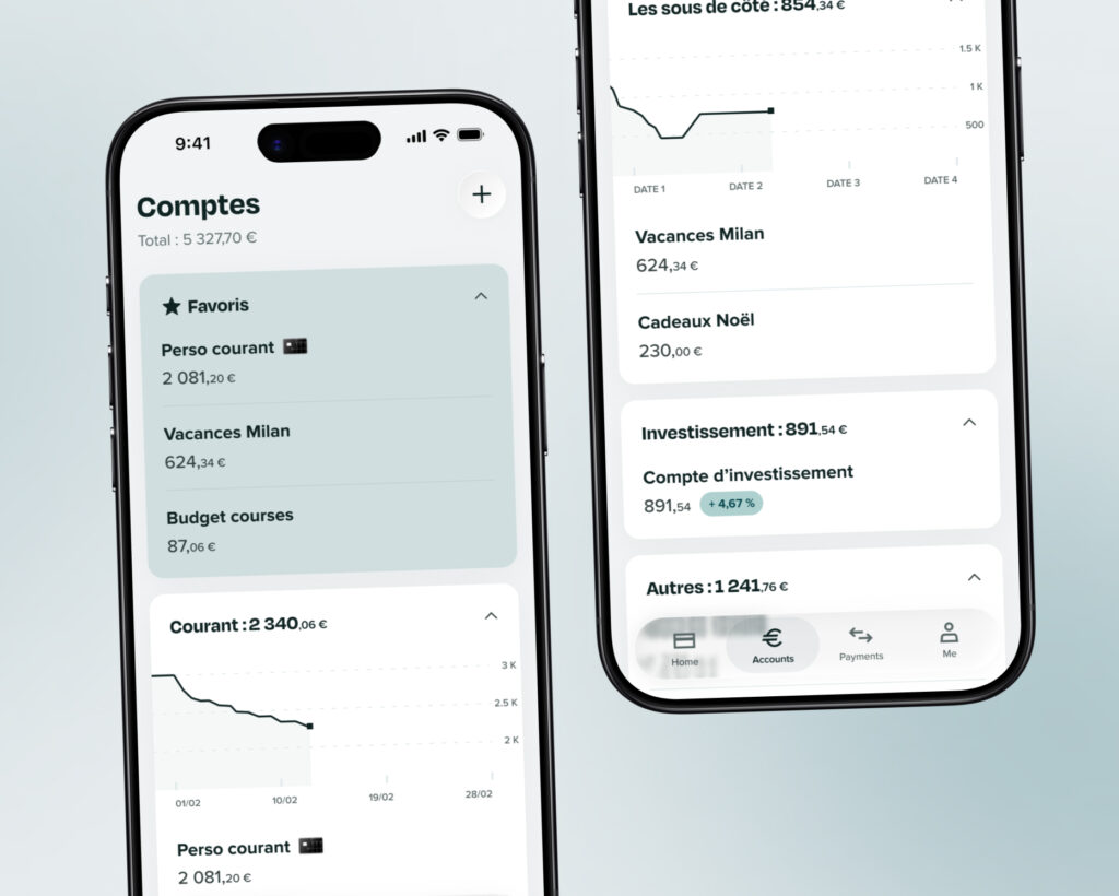 Les sous-onglets disparaissent de l’écran Comptes. Les comptes d’investissement, les comptes d’autres banques suivis dans Sumeria et les comptes Lydia sont désormais tous réunis dans une seule liste avec vos comptes Sumeria, bien organisés dans des sections distinctes.