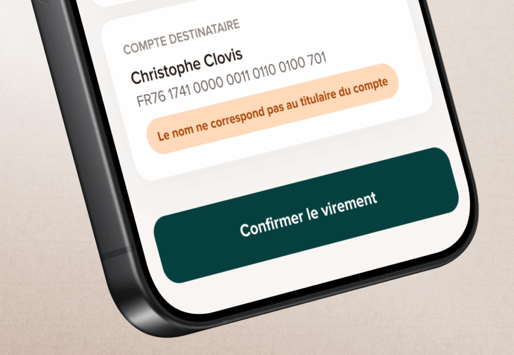 Nous avons intégré ce dispositif directement dans votre application. Désormais, lorsque vous réalisez un virement, en plus du nom de la banque du destinataire que nous avions déjà ajouté il y a quelques mois, vous verrez apparaître une confirmation que le nom saisi correspond (ou non) au titulaire réel du compte lié à l’IBAN.