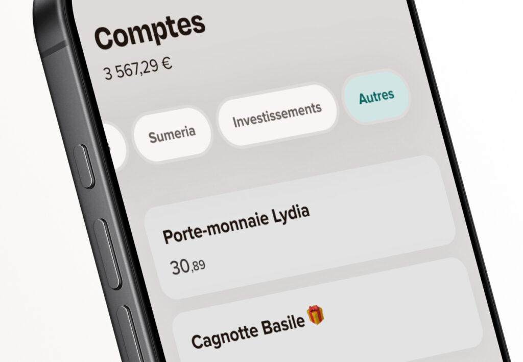 Les comptes de vos autres banques et les cagnottes Lydia, que vous suivriez depuis Sumeria, sont déplacés dans un nouvel onglet de l’écran Comptes. Cette nouvelle catégorie de compte, nommée “Autres”, s’ajoute aux autres catégories déjà existantes : Comptes bancaires “Sumeria”, “Investissement”, et “Favoris”.