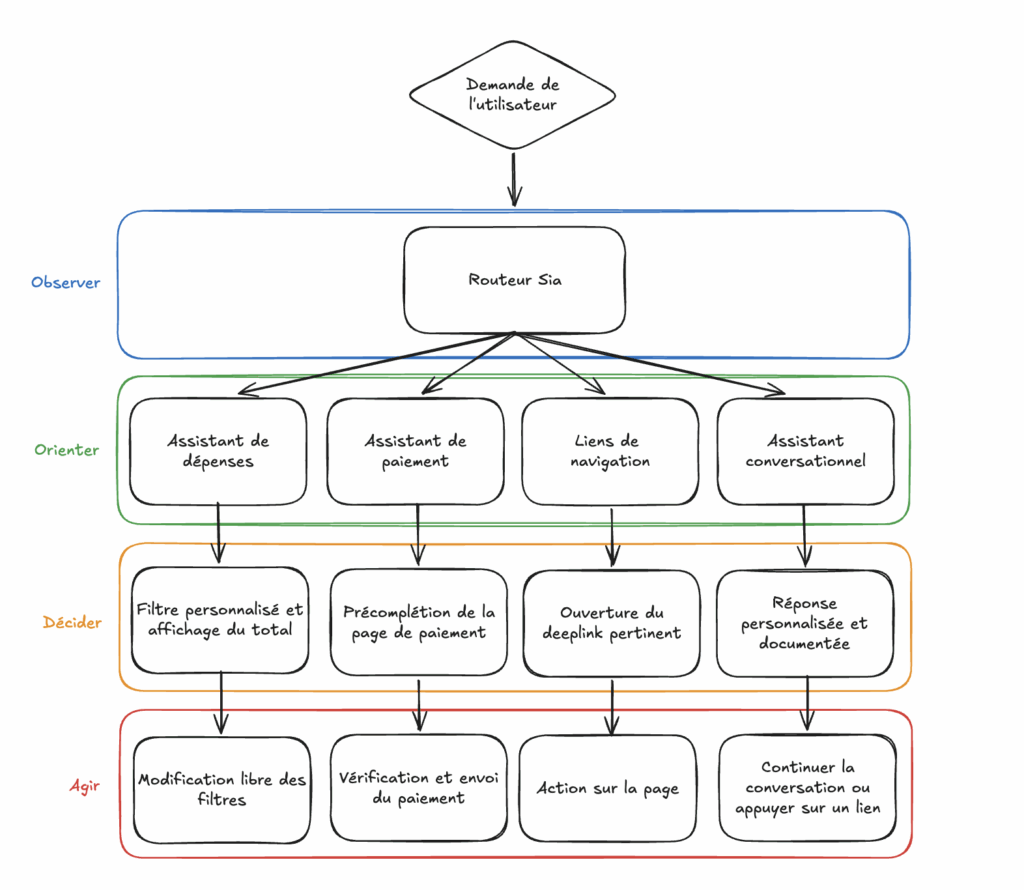 Toute demande effectuée par un utilisateur est d’abord envoyée au Routeur Sia. Il s’agit de la brique fondamentale du système. Son rôle est d’identifier l’intention de l’utilisateur et de rediriger la requête vers le bon outil, en fonction des capacités disponibles.