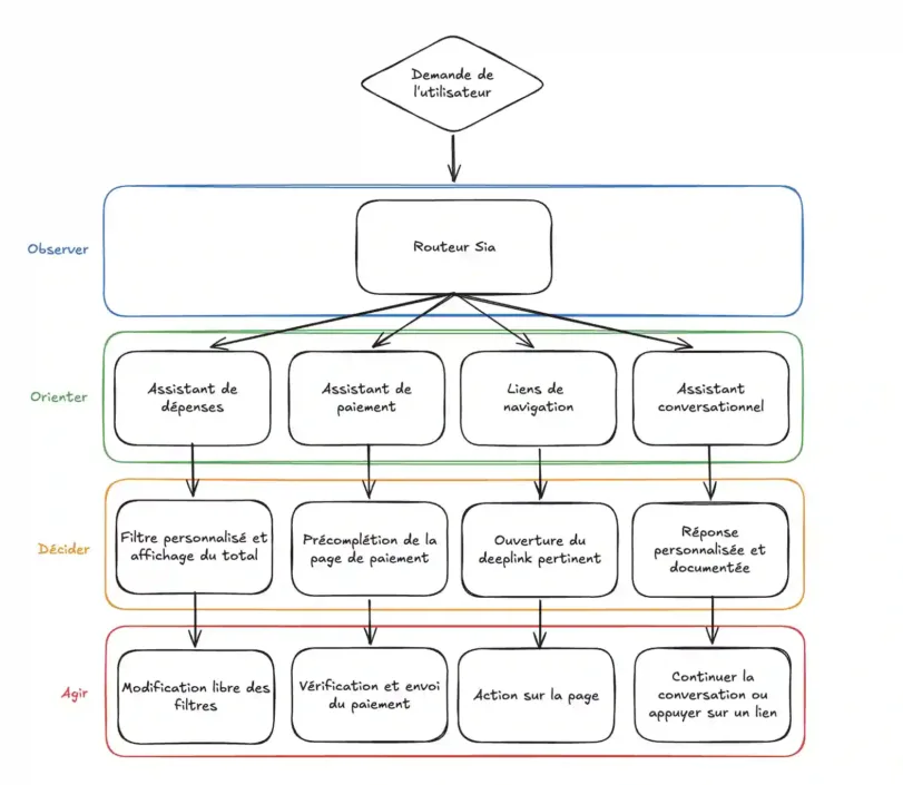 Sur le papier, le modèle est simple. En pratique, il nécessite une orchestration précise entre compréhension du langage, données bancaires, règles de sécurité et logique produit.
